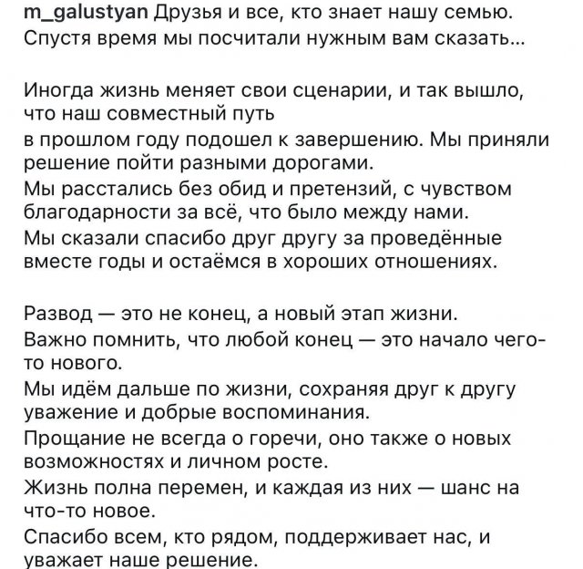 Михаил Галустян разводится после 18 лет брака 30/04/2025 21:20 Юморист Михаил Галустян сообщил, что разводится с женой после 18 лет совместной жизни. Пара была вместе долгие годы, но пришла к решению идти разными путями. У них есть две дочери. Главная / Картинки +1 Admin 4 206