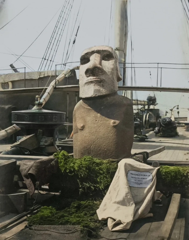 Статуя с острова Пасхи на борту английского корабля, во время перевозки в Англию, 1868 год.