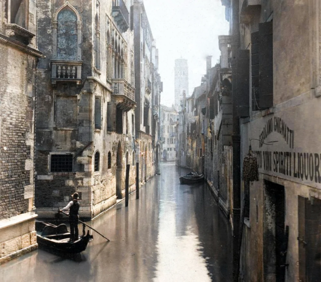 Гондольер (лодочник) на канале среди жилых домов города Венеции. Королевство Италия, 1900 год.