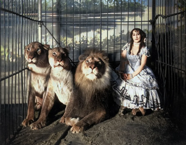 Дрессировщица Аджи сидит в клетке со львом и двумя львицами, 1899 год.