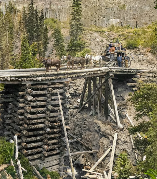 Дилижанс на высоком мосту на линии Ouray Stage Line между шахтерскими городками Урей и Сильвертон. Колорадо, США. Около 1890-х гг.