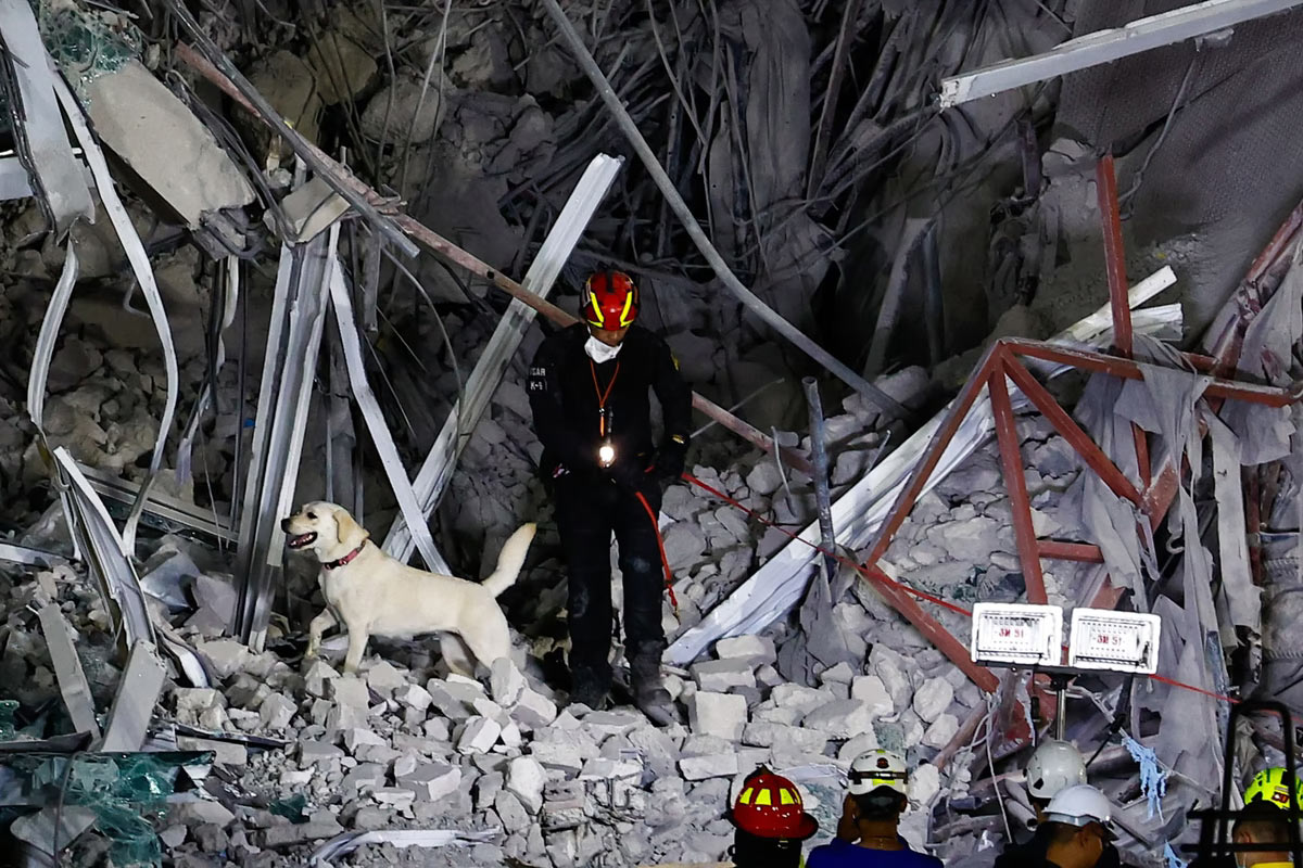 Спасатели задействуют служебную собаку для поиска выживших, поскольку, как полагают, десятки людей оказались в ловушке под обломками рухнувшего высотного здания, которое все еще строилось после землетрясения магнитудой 7.7, произошедшего в соседней стране Мьянма, в Бангкоке, Таиланд, 29 марта 2025 года. (Фото Дэниел Ценг):