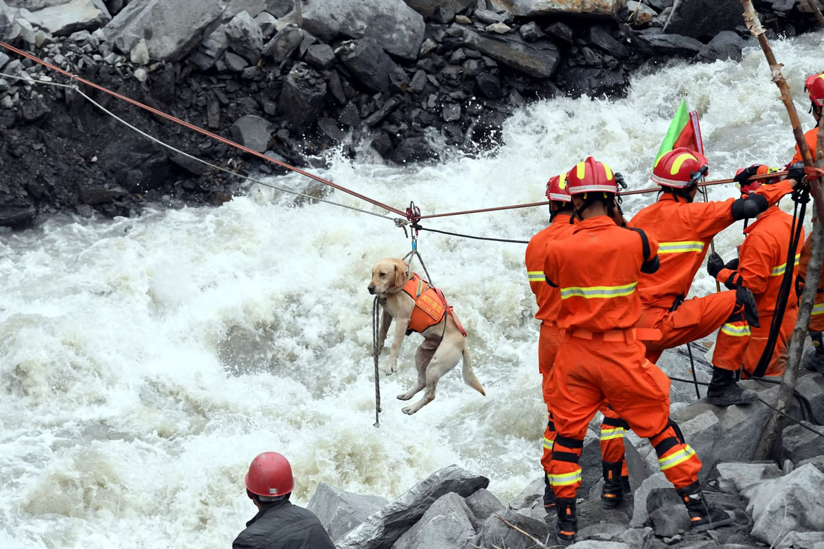 Рабочие перетаскивают собаку-спасателя через реку на месте оползня в деревне Синьмо, уезд Мао, провинция Сычуань, Китай, 25 июня 2017 года. (Фото Юань / CNS):