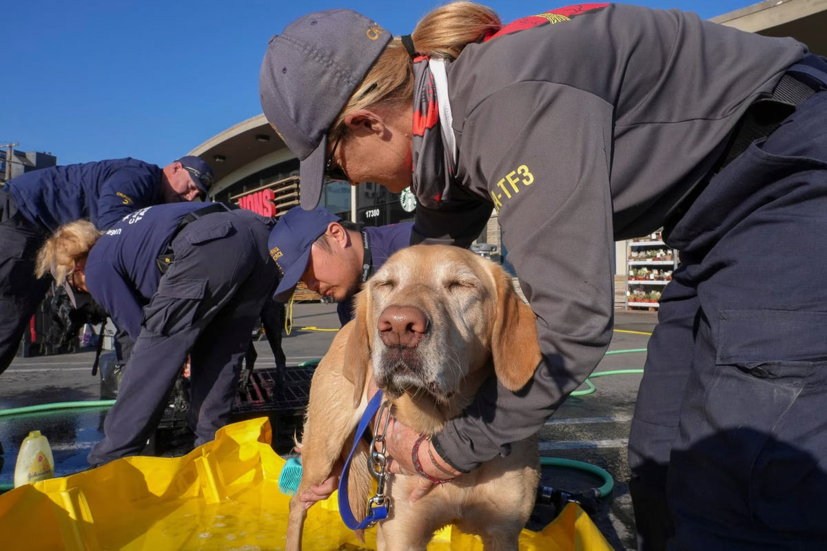 Четырехлетняя лабрадорша Тулла купается после работы в Pacific Palisades 17 января 2025 года. Поисково-спасательные собаки из Национального фонда собак для поиска жертв стихийных бедствий были отправлены на помощь пострадавшим от лесных пожаров в некоторых районах Калифорнии. (Фото Меган Смит):