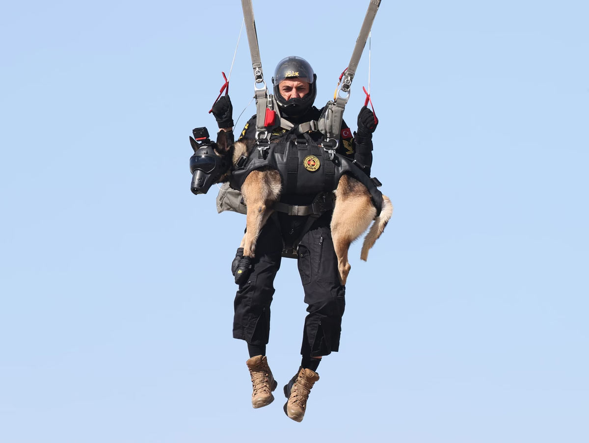 Поисково-спасательная собака по кличке Мака из Главного командования турецкой жандармерии принимает участие в обучении прыжкам с парашютом в авиационном центре Сиврихисар в районе Сиврихисар города Эскишехир, Турция, 12 октября 2023 года. (Фото Джем Дженко / Anadolu):