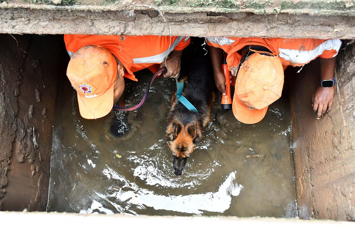 Сотрудники службы реагирования на стихийные бедствия с собакой-ищейкой проводят поисковую операцию после того, как ребенок, как сообщается, упал в ливневую канализацию после сильного дождя в Джоти Нагаре в Гувахати, Индия, 5 июля 2024 года. (Фото Питамбер Невар):