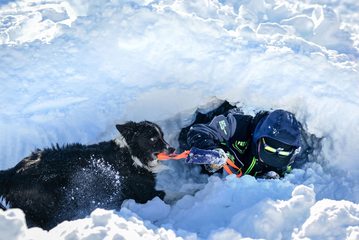 Лавинная собака принимает участие в учениях по поиску и спасению жертв лавины на горнолыжном курорте Ла-Розьер во Французских Альпах, Франция, 4 февраля 2025 года. (Фото Оливье Шассиньоль):
