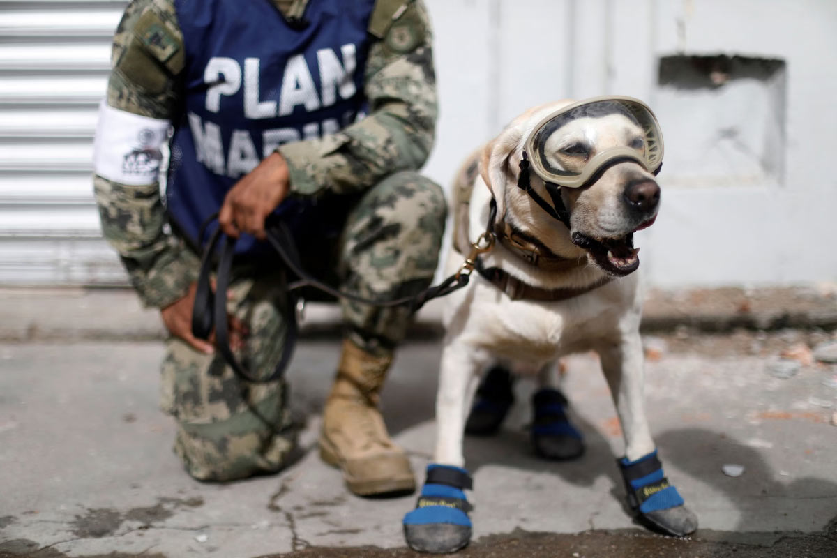 Военнослужащий мексиканских ВМС стоит на коленях рядом со спасательной собакой после землетрясения на южном побережье Мексики в Хучитане, Мексика, 10 сентября 2017 года. (Фото Эдгард Гарридо):