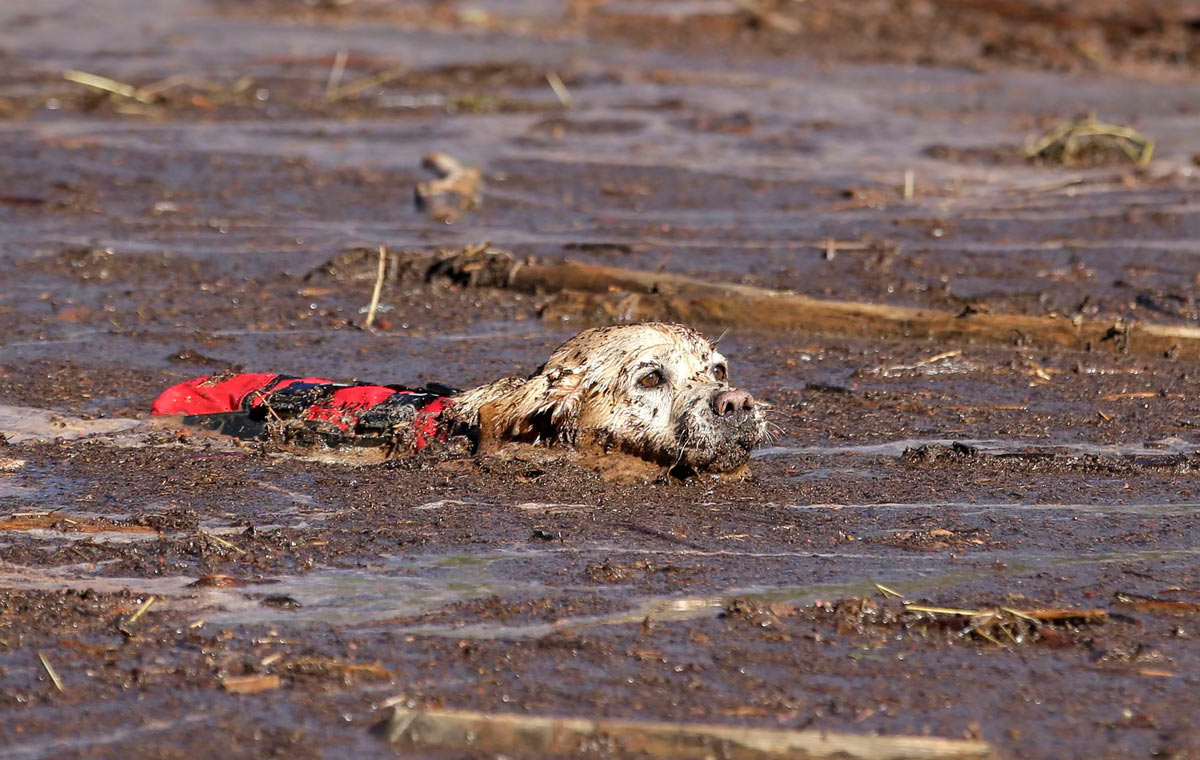 Собака-ищейка плывет через грязь и мусор во время поиска оставшейся жертвы внезапного наводнения в Хилдейле, штат Юта, 17 сентября 2015 года. (Фото Рик Боумер):