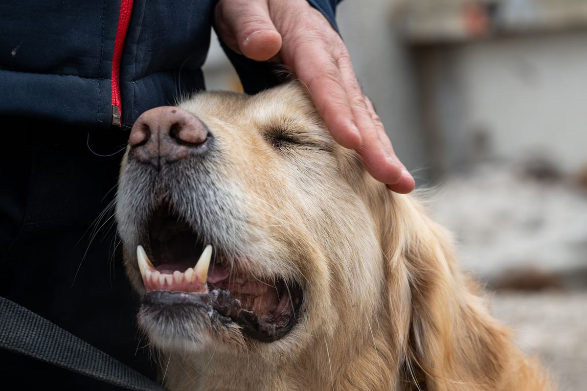Дрессировщик гладит одну из поисково-спасательных собак, которые помогают тренировать других собак в Анкаре, Турция, 9 января 2024 года. (Фото Омер Таха Четин / Анадолу):