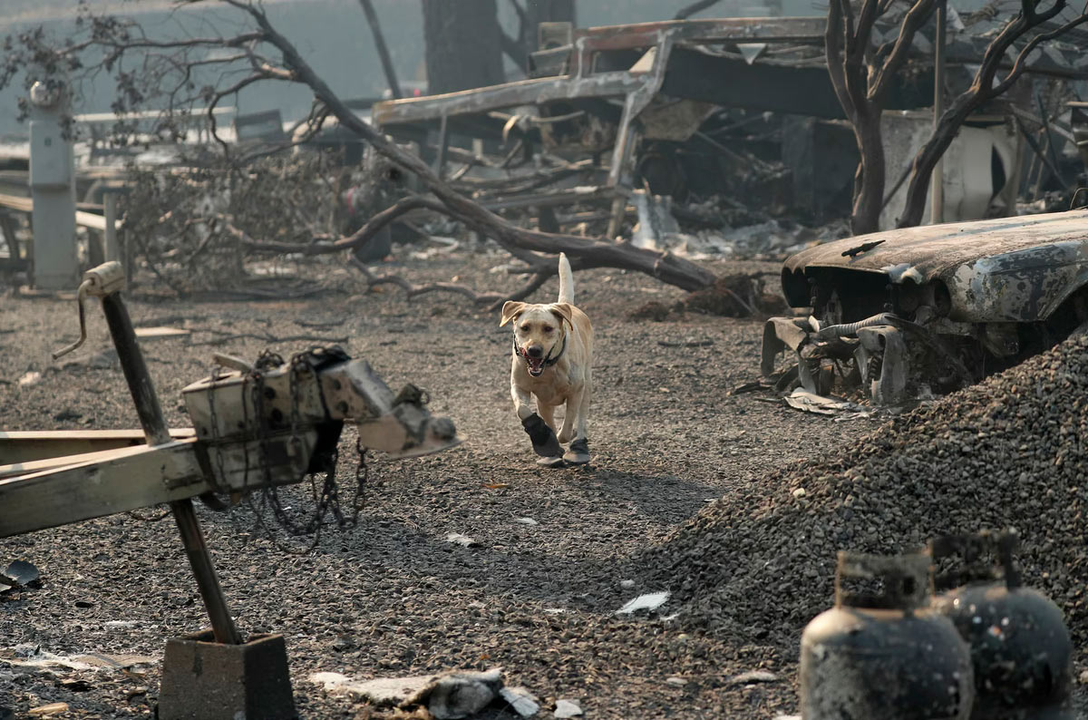 Сотрудник поисково-спасательной службы, разыскивающий жертв пожара Camp Fire, несет Сьюзи Кью в безопасное место после того, как служебная собака провалилась под завалы в поместье Холли Хиллз Мобайл Эстейтс 14 ноября 2018 года в Парадайсе, Калифорния. (Фото Ной Бергер):
