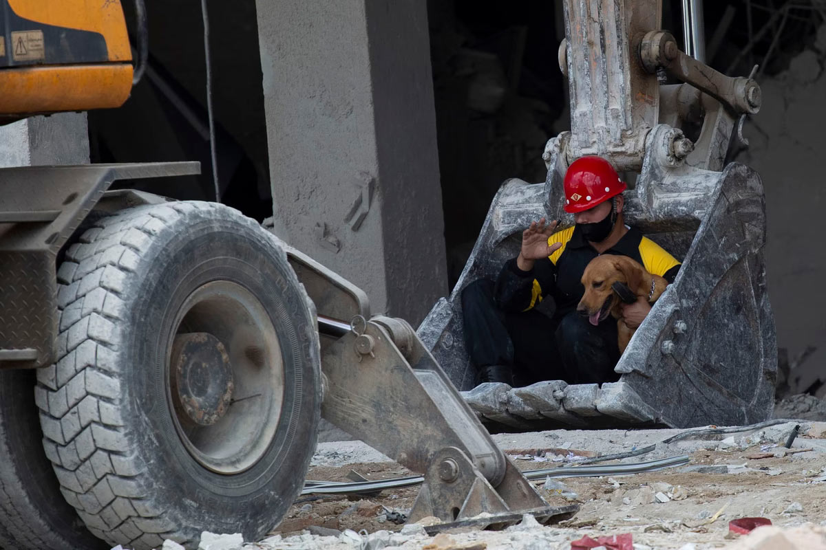 Спасатель и его поисковая собака готовятся к подъему в ковше экскаватора для поиска выживших на месте смертоносного взрыва, уничтожившего отель Saratoga в Старой Гаване, Куба, 8 мая 2022 года. (Фото Исмаэль Франциско):