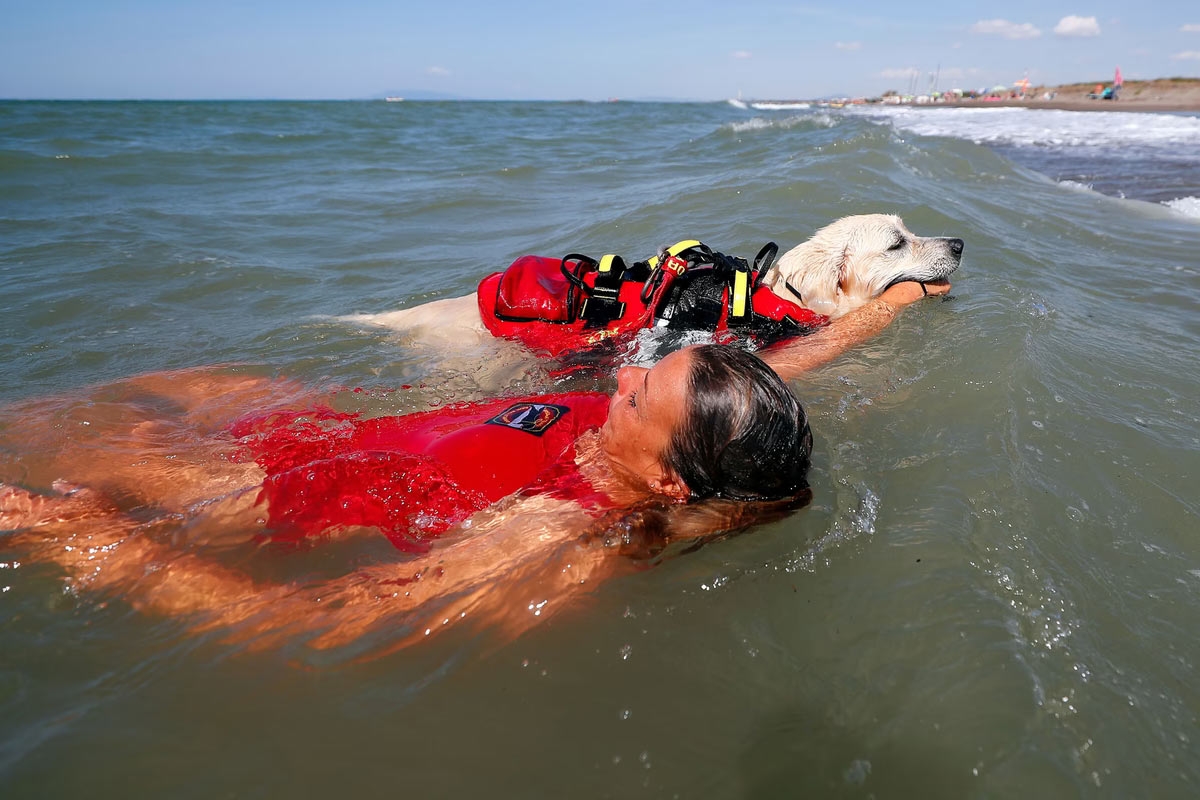 Член женской группы собак-спасателей из Итальянской школы собак-спасателей (La Scuola Italiana Cani Salvataggio) посещает тренировку со своей собакой перед патрулированием пляжа, чтобы гарантировать, что пловцы могут безопасно наслаждаться отдыхом на море, в Рива-дей-Тарквини, недалеко от Рима, Италия, 25 августа 2020 года. (Фото Гульельмо Манджапане):