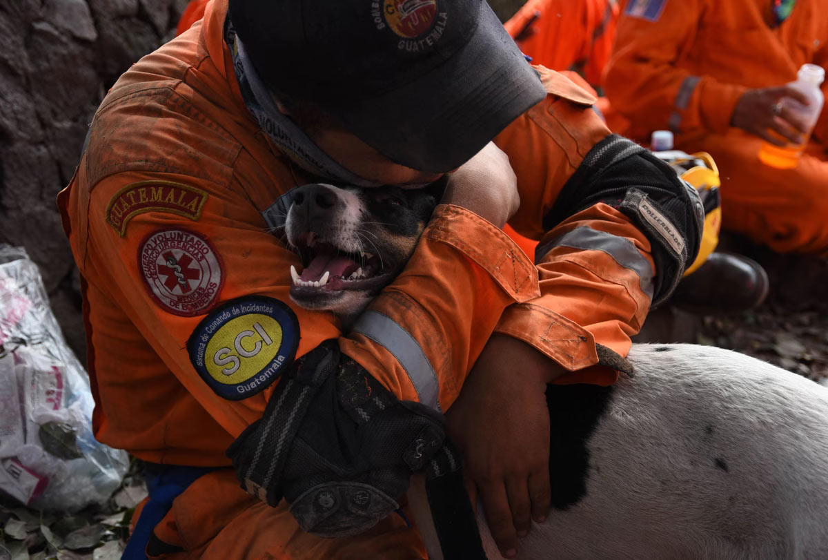 Пожарный-доброволец обнимает собаку во время поиска жертв извержения вулкана Фуэго в Алотенанго, муниципалитете в департаменте Сакатепекес, Гватемала, 6 июня 2018 года. (Фото Орландо Эстрада):