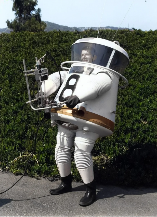 Ученый НАСА Эллин Хапп Хазард позирует в созданном им самим костюме для исследования Луны «Марк 1» или «зефирном лунном костюме». Калифорния, США, 1960 год.