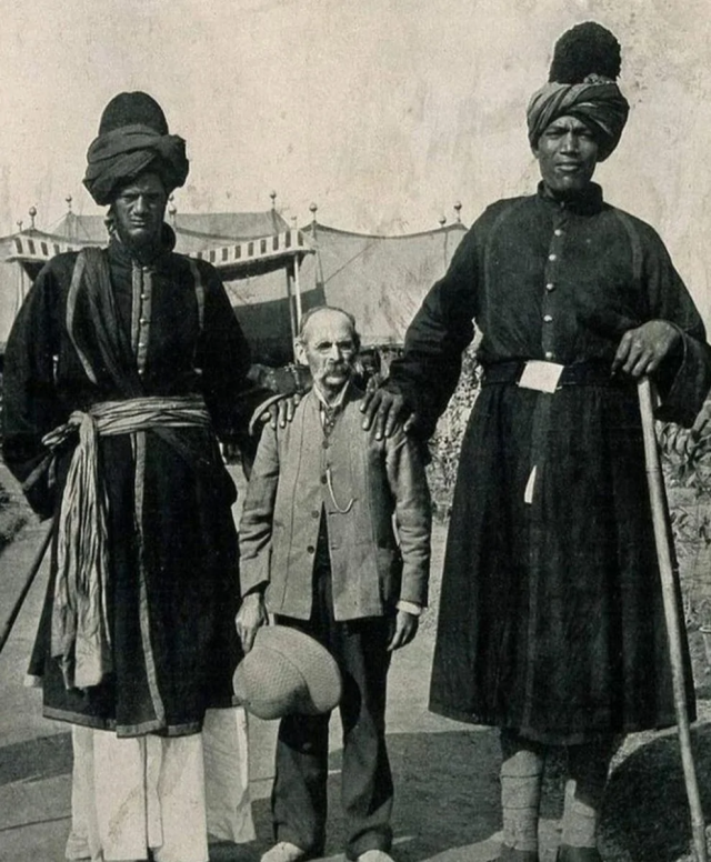 Джеймс Рикалтон — путешественник и изобретатель, сфотографировался с охранниками Махараджи. Один ростом 224 см, второй — 236 см. Такие гиганты жили в Индии в 1902 году