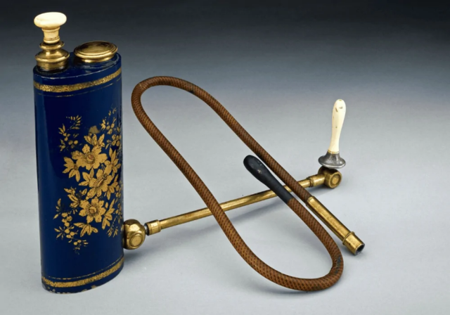 Металлическая поршневая клизма с ёмкостью, а наконечники сменные, XIX век