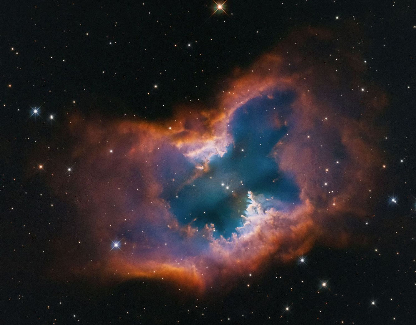 На этом снимке Хаббла запечатлена красота похожей на мотылька планетарной туманности NGC 2899. Этот объект имеет биполярный цилиндрический истечение газа, движущееся излучением и звездными ветрами из горячего белого карлика в центре. Возможно, есть две звезды-компаньона, которые взаимодействуют и формируют туманность, которая сжата посередине фрагментированным кольцом или тором, похожим на наполовину съеденный пончик. У нее есть лес газообразных «столбов», которые указывают на источник излучения и звездных ветров. Туманность находится примерно в 4500 световых годах от нас в южном созвездии Паруса. (Фото NASA, ESA, STScI):