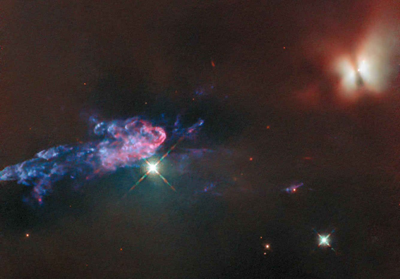 Вид на пыльные недра ближайшей к Земле массивной области звездообразования, туманности Ориона, находящейся примерно в 1300 световых годах от нас. Туманность является домом для сотен новорожденных звезд, включая объект этого изображения: протозвезд HOPS 150 и HOPS 153. Эти протозвезды получили свои названия от Herschel Orion Protostar Survey. Объект, который можно увидеть в правом верхнем углу этого изображения, — HOPS 150: это двойная система из двух молодых протозвезд, вращающихся друг вокруг друга. У каждой есть небольшой пылевой диск материала, окружающий ее, из которого она питается. Темная линия, которая пересекает яркое свечение этих протозвезд, представляет собой облако газа и пыли, более чем в 2000 раз шире расстояния между Землей и Солнцем, падающее на пару протозвезд. Вдоль левой стороны изображения простирается узкий, красочный поток, называемый струей, который исходит от близлежащей протозвезды HOPS 153, находящейся за кадром. HOPS 153 — значительно более молодой звездный объект, чем ее сосед, все еще глубоко погруженный в свою родовую туманность и окутанный облаком холодного, плотного газа. (Фото ESA / Hubble & NASA, T. Megeath):