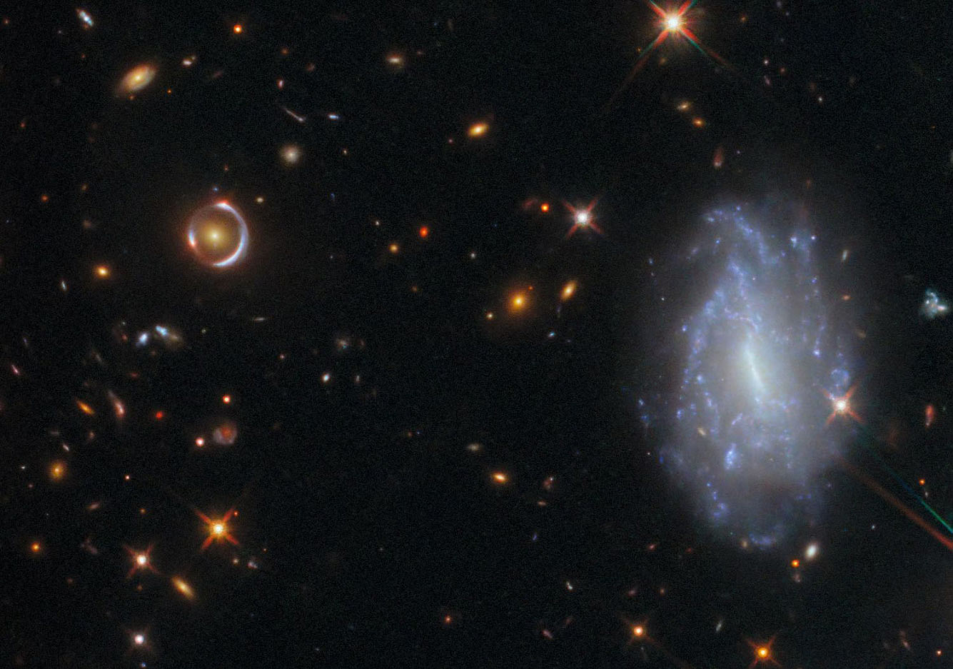 Крошечный участок неба в созвездии Гидры. Звезды и галактики, изображенные здесь, охватывают умопомрачительный диапазон расстояний. Ближайшие к нам на этом изображении — звезды в нашей галактике Млечный Путь, отмеченные дифракционными пиками. Яркая звезда, которая находится прямо на краю выдающейся голубоватой галактики, находится всего в 3230 световых годах от нас, согласно измерениям космической обсерватории Gaia Европейского космического агентства. За этой звездой находится галактика под названием LEDA 803211. Находясь на расстоянии 622 миллионов световых лет, эта галактика достаточно близка, чтобы ее яркое галактическое ядро было отчетливо видно. Многие из более далеких галактик на этом кадре выглядят звездообразными, без различимой структуры, но и без дифракционных пиков звезды в нашей галактике. Из всех галактик на этом кадре одна пара выделяется особенно: гладкая золотая галактика, окруженная почти полным кольцом слева. Эта любопытная конфигурация является результатом гравитационного линзирования, когда далекий объект деформируется и увеличивается под действием гравитации массивного объекта переднего плана. Линзированная галактика, изображение которой мы видим как кольцо, находится невероятно далеко от Земли. Мы видим ее такой, какой она была, когда Вселенной было всего 2,5 миллиарда лет. (Фото ESA / Hubble & NASA, D. Erb):
