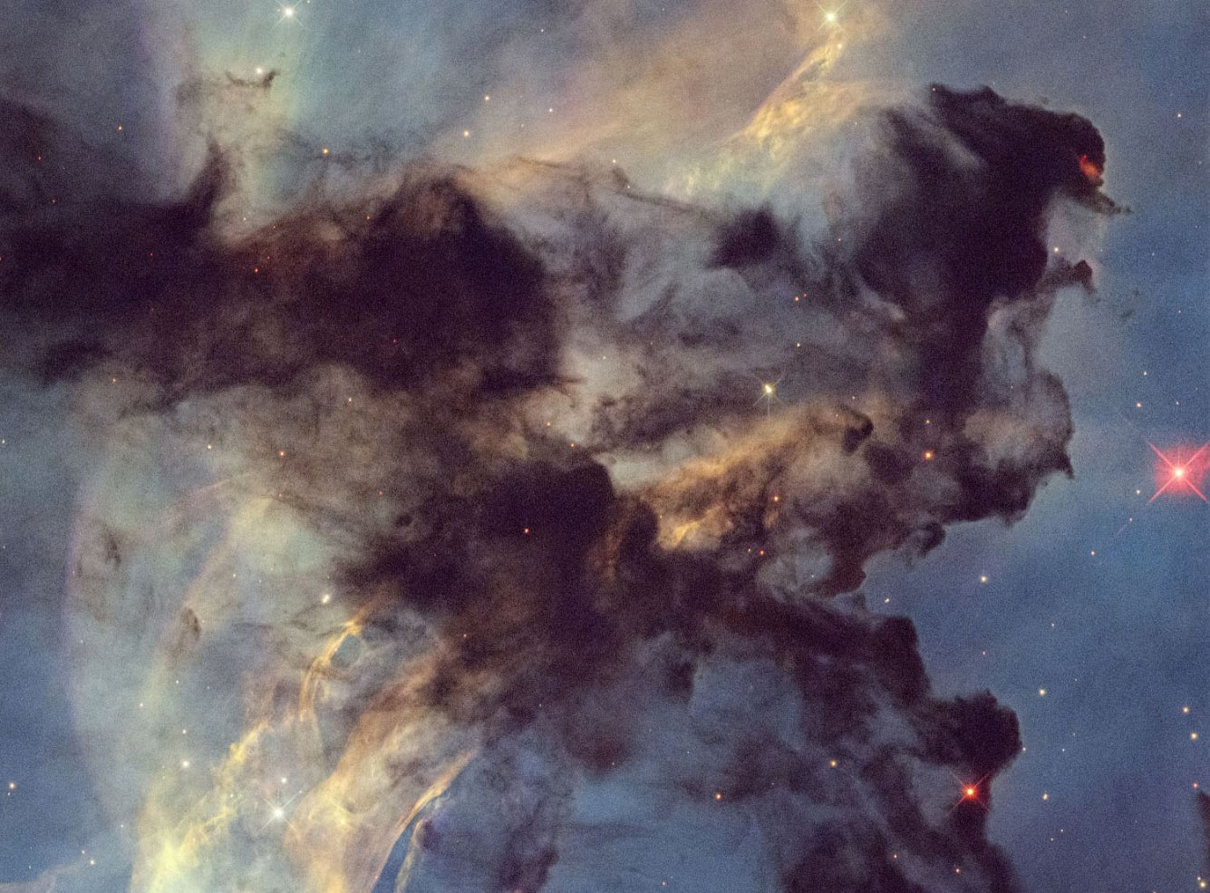 Сверкающая и пыльная сцена из Большого Магелланова Облака, одной из галактик-спутников Млечного Пути, находящейся примерно в 160 000 световых лет от нас. Область, изображенная здесь, находится на окраине Туманности Тарантул, крупнейшей и самой продуктивной области звездообразования в локальной Вселенной. В своем центре Туманность Тарантул содержит самые массивные известные звезды, которые весят примерно в 200 раз больше массы Солнца. Часть туманности, показанная здесь, состоит из спокойного голубого газа, коричневато-оранжевых пылевых пятен и россыпи разноцветных звезд. Звезды внутри и за пылевыми облаками кажутся краснее тех, которые не скрыты пылью. (Фото ESA / Hubble & NASA, C. Murray):