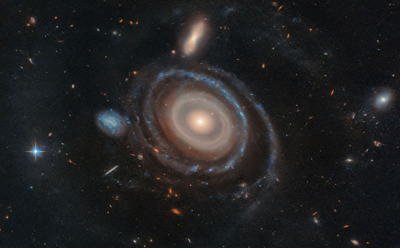 Наблюдения Хаббла позволили исследователям сосредоточиться на большем количестве колец галактики Буллсай — и помогли подтвердить, какая галактика нырнула через ее ядро. LEDA 1313424, метко названная Буллсай, в два с половиной раза больше нашего Млечного Пути и имеет девять колец — на шесть больше, чем у любой другой известной галактики. Хаббл подтвердил восемь колец, а данные обсерватории У. М. Кека на Гавайях подтвердили девятое. Хаббл и Кек также подтвердили, какая галактика нырнула через Буллсай, создав эти кольца: голубая карликовая галактика, которая находится непосредственно в ее центре слева. Этот относительно крошечный нарушитель пролетел, как дротик, через ядро Буллсай около 50 миллионов лет назад, оставив за собой кольца, похожие на рябь в пруду. Теперь эту пару связывает тонкий след газа, хотя в настоящее время они разделены 130 000 световых лет. (Фото NASA, ESA):