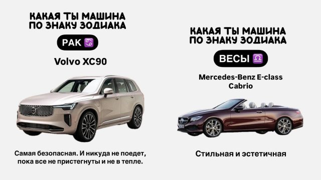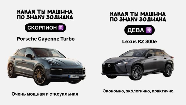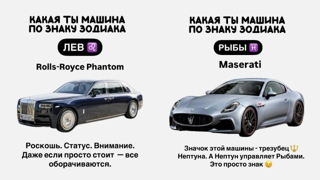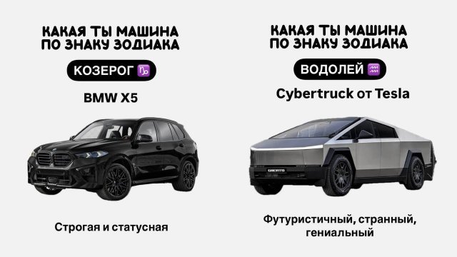 Какая машина соответствует вашему знаку зодиака? 09/06/2025 22:40 Астрологи продолжают исследовать небо и утверждают, что каждому знаку зодиака соответствует своя модель машины. Звучит странно, но давайте посмотрим, совпадёт ли ваша тачка с прогнозом! Главная / Картинки -3 Admin 0 99