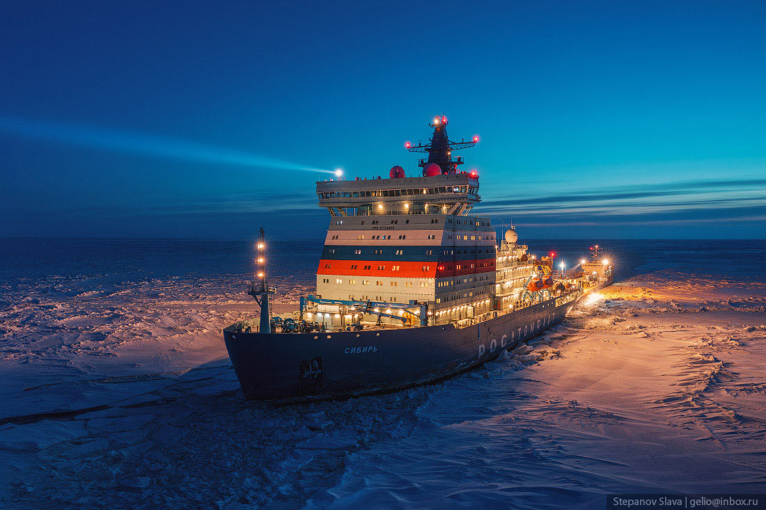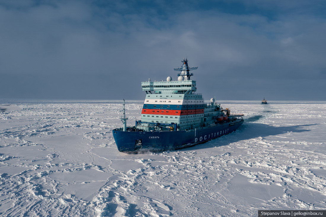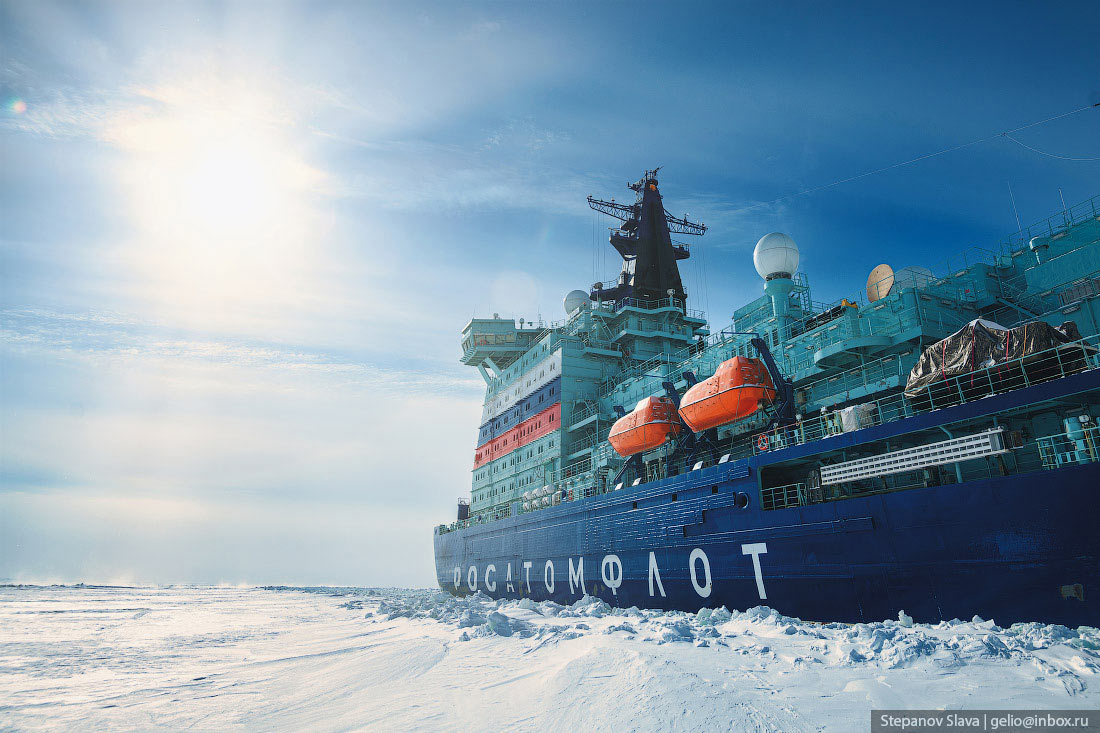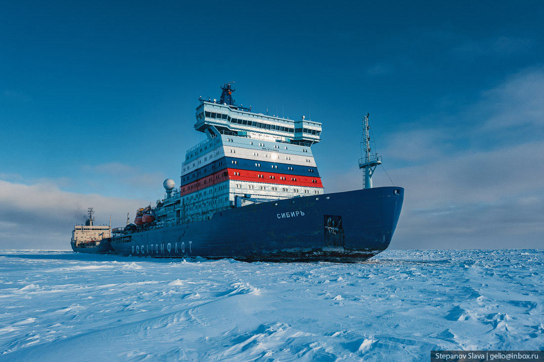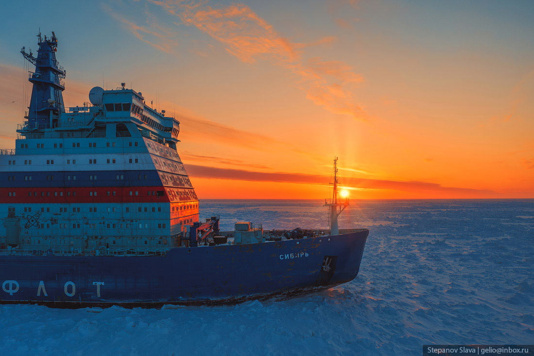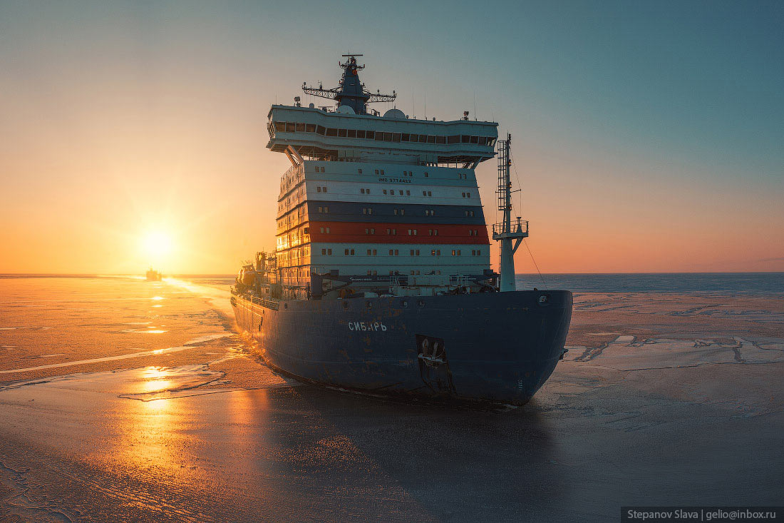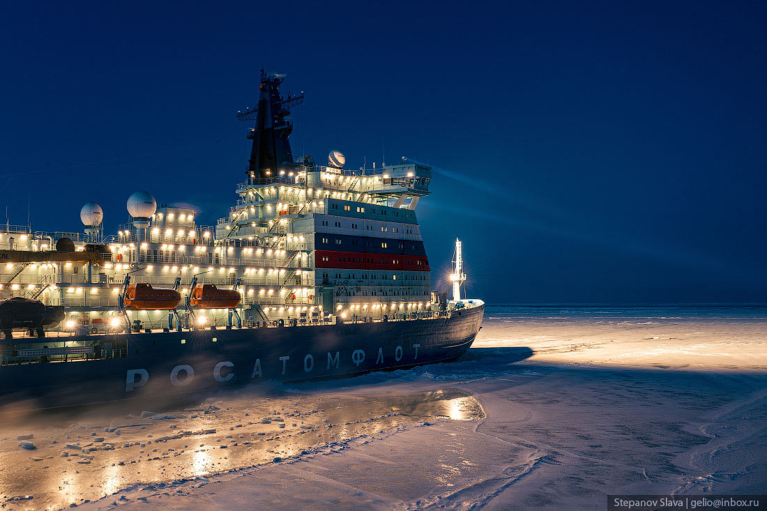 Фотографии и текст Славы Степанова 1. Россия — единственная страна в мире, которая обладает атомным ледокольным флотом. Атомные ледоколы обеспечивают безопасное судоходство в Арктике, это ключевое звено в работе на Северном морском пути. Арктикой называют всю область планеты за Северным полярным кругом. Площадь российского сектора около 9 млн квадратных километров. Это очень перспективная территория как по полезным ископаемым, так и в плане транспортного пути. Именно здесь находятся одни из крупнейших газовых и газоконденсатных месторождений, а Северный морской путь позволяет перевозить грузы между Европой и странами Азиатско-Тихоокеанского региона по кратчайшему судоходному маршруту. И в большинстве арктических проектов участвует атомный ледокольный флот.