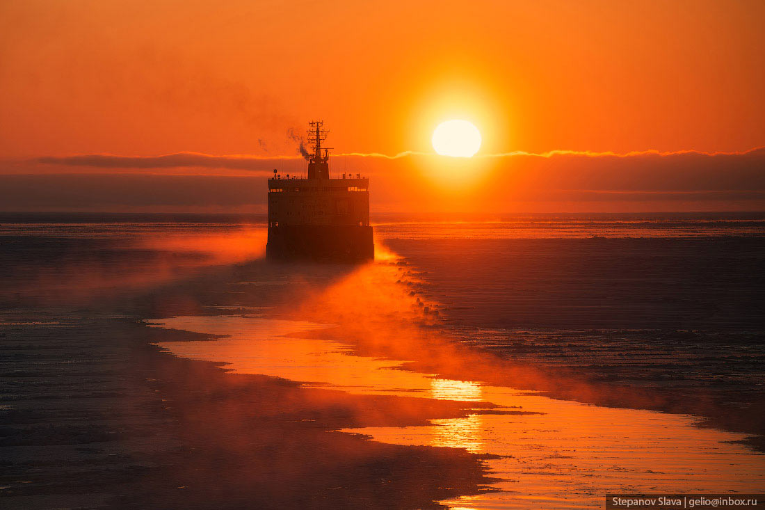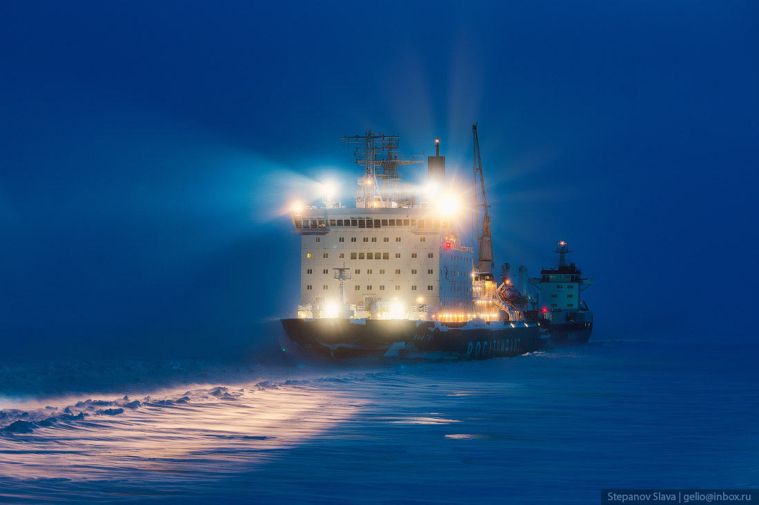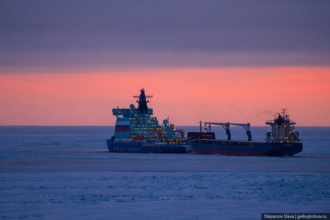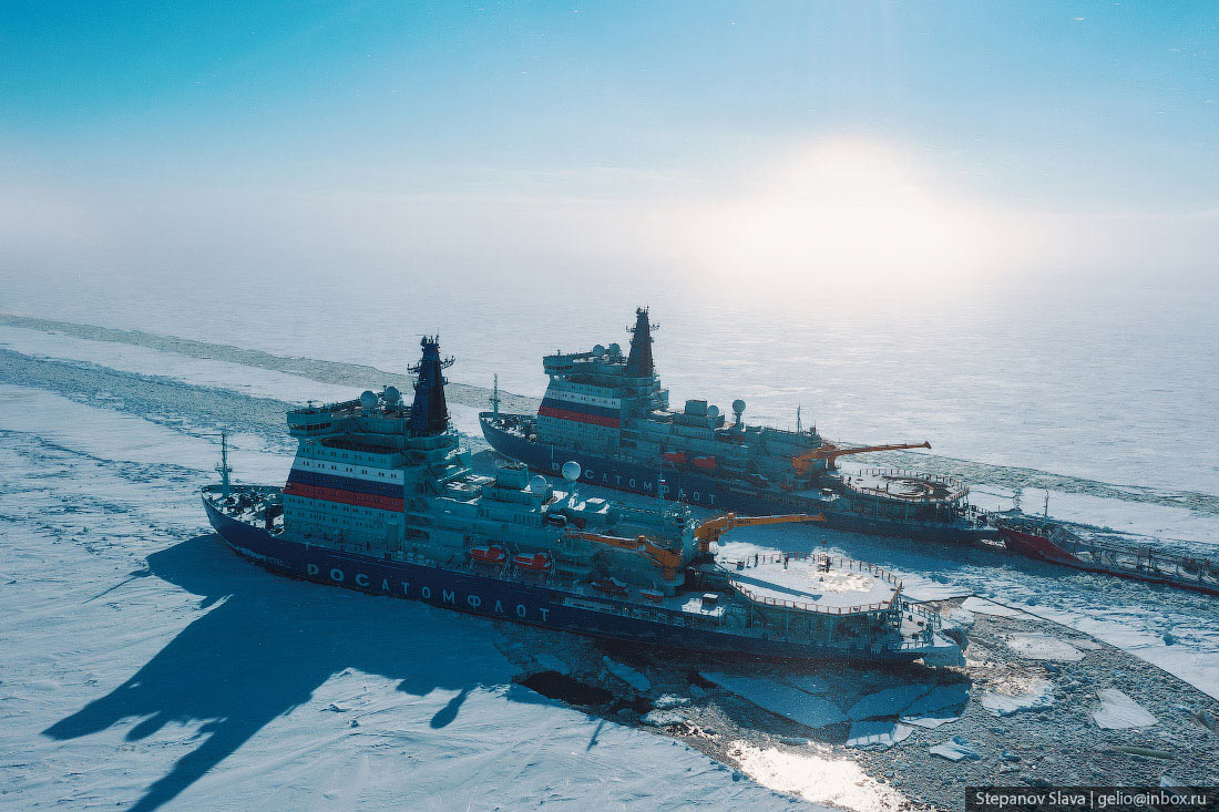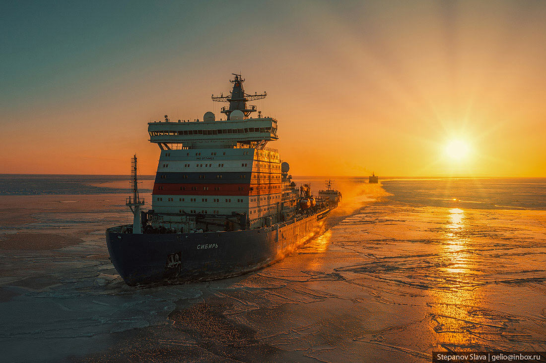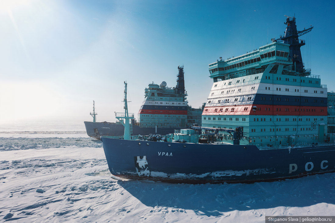Фотографии и текст Славы Степанова 1. Россия — единственная страна в мире, которая обладает атомным ледокольным флотом. Атомные ледоколы обеспечивают безопасное судоходство в Арктике, это ключевое звено в работе на Северном морском пути. Арктикой называют всю область планеты за Северным полярным кругом. Площадь российского сектора около 9 млн квадратных километров. Это очень перспективная территория как по полезным ископаемым, так и в плане транспортного пути. Именно здесь находятся одни из крупнейших газовых и газоконденсатных месторождений, а Северный морской путь позволяет перевозить грузы между Европой и странами Азиатско-Тихоокеанского региона по кратчайшему судоходному маршруту. И в большинстве арктических проектов участвует атомный ледокольный флот.