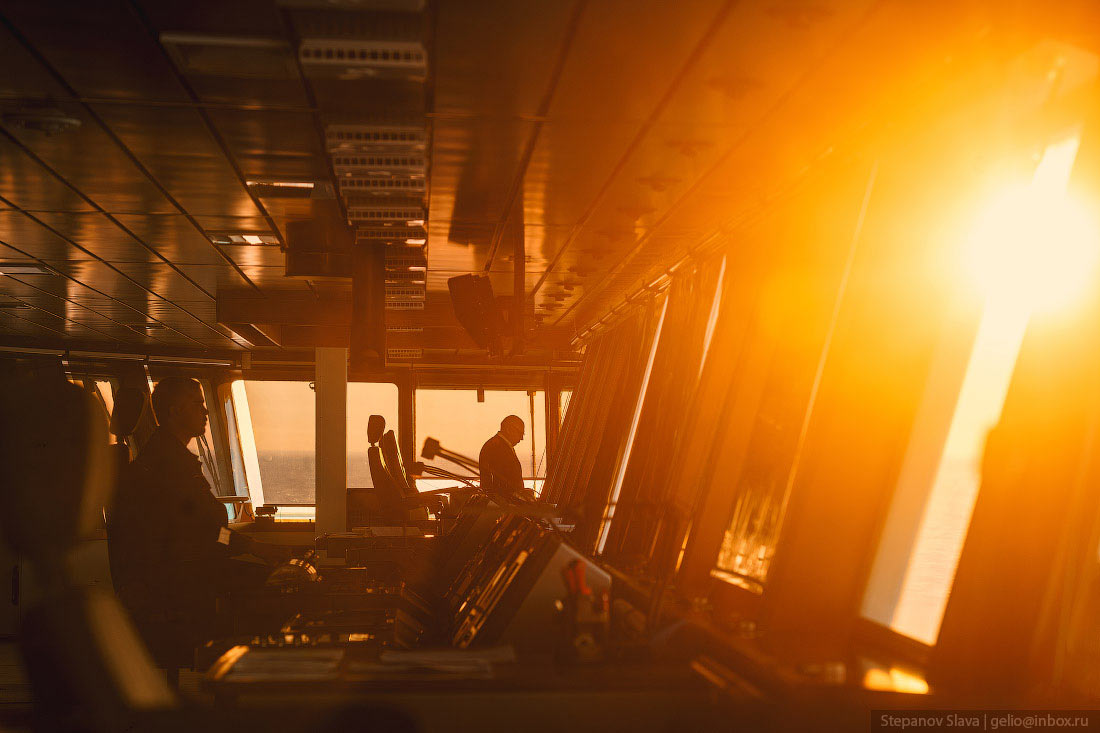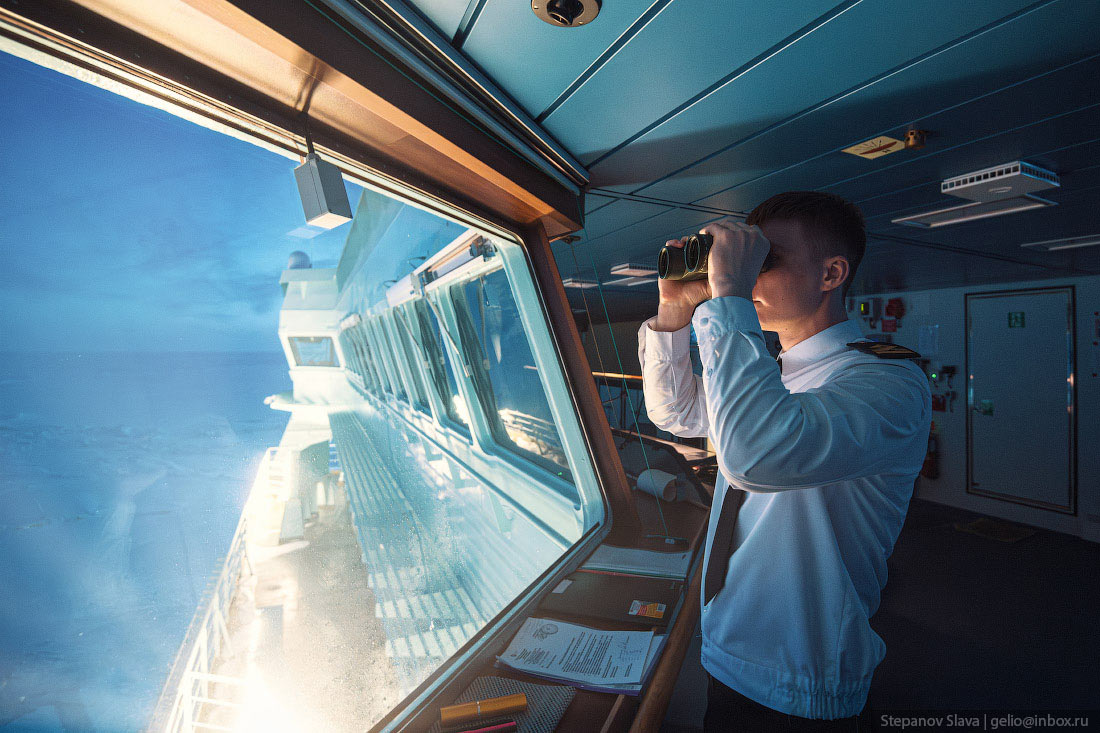 11. На ходовой мостик стекается вся информация — здесь установлено оборудование для определения курса, контроля за окружающей надводной и подводной обстановкой. Вахту несут старший помощник капитана, вахтенный помощник и вахтенный матрос. Продолжительность вахты — 4 часа, затем 8 часов отдыха.