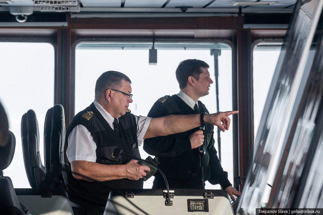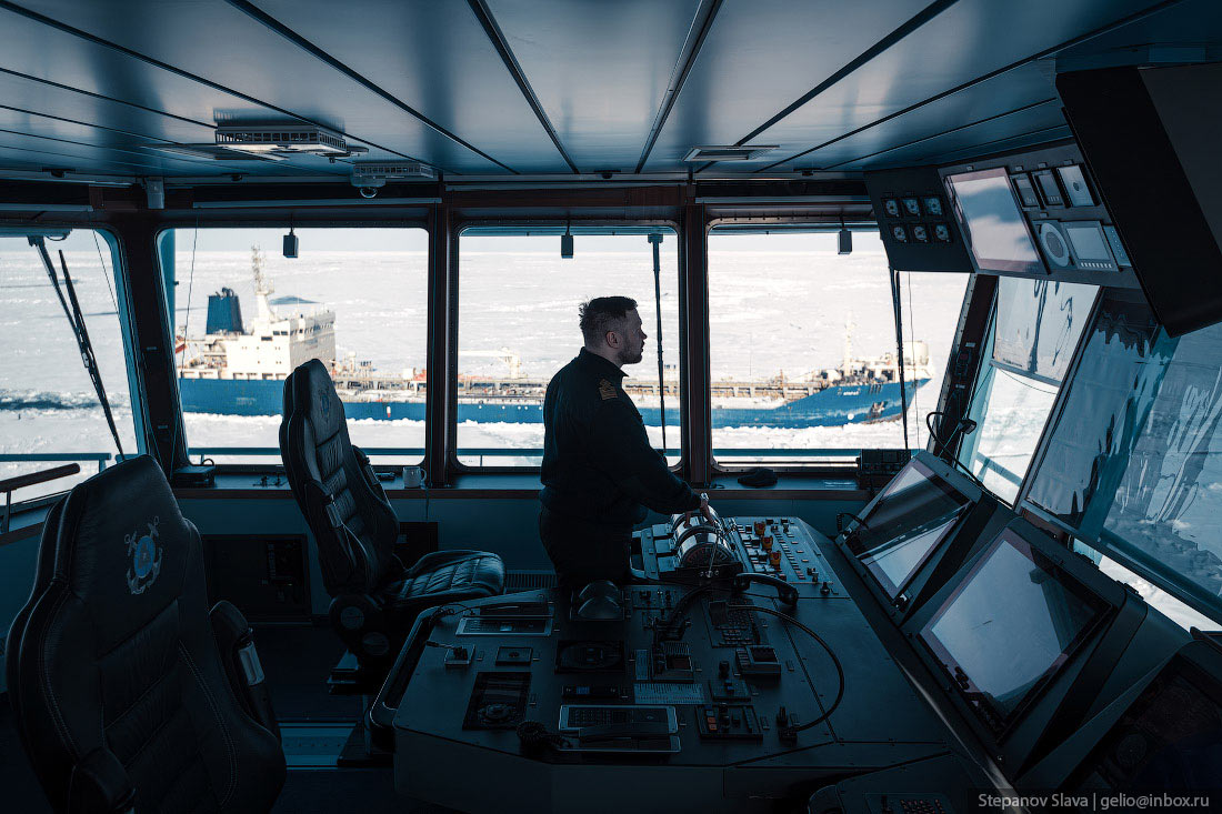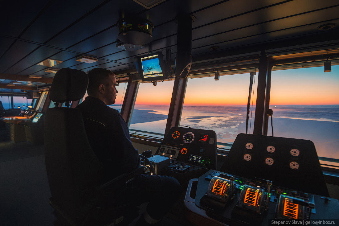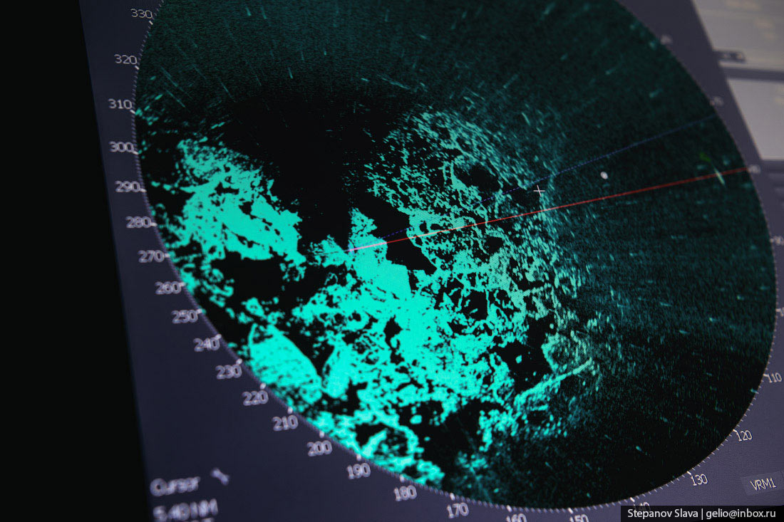 19. Современный атомный ледокол — это гигантский компьютер. Можно контролировать ключевые параметры на мониторах, на ходовом мостике есть приборы контроля за буксирным устройством, камера наблюдения за буксиром, эхолоты, репитеры гирокомпаса, радиостанции, электронное навигационное оборудование, спутниковые системы. Часть внешнего оборудования имеет систему подогрева, чтобы электроника работала без перебоев в любой мороз.
