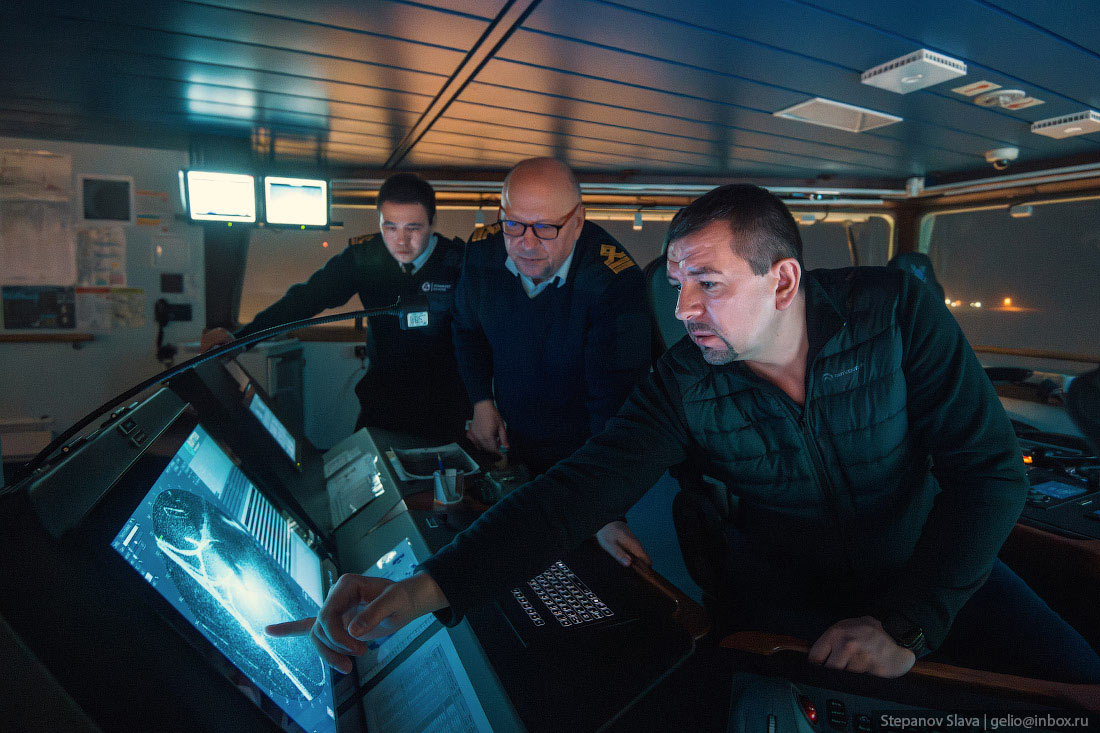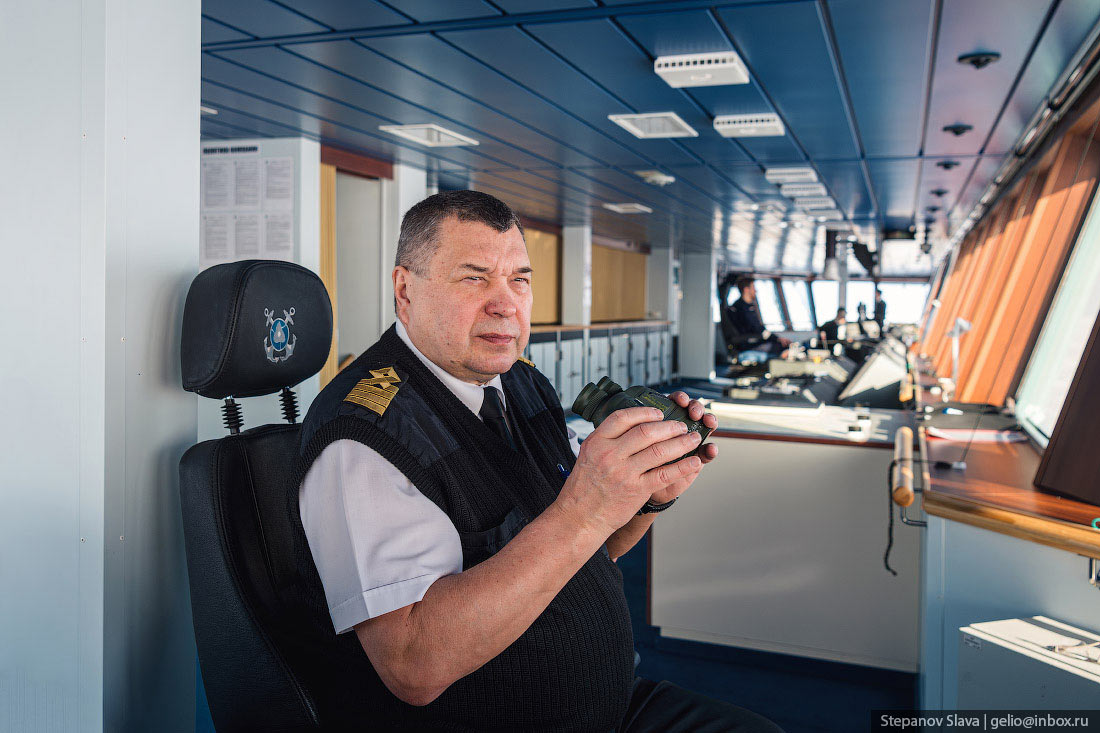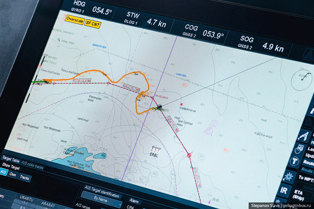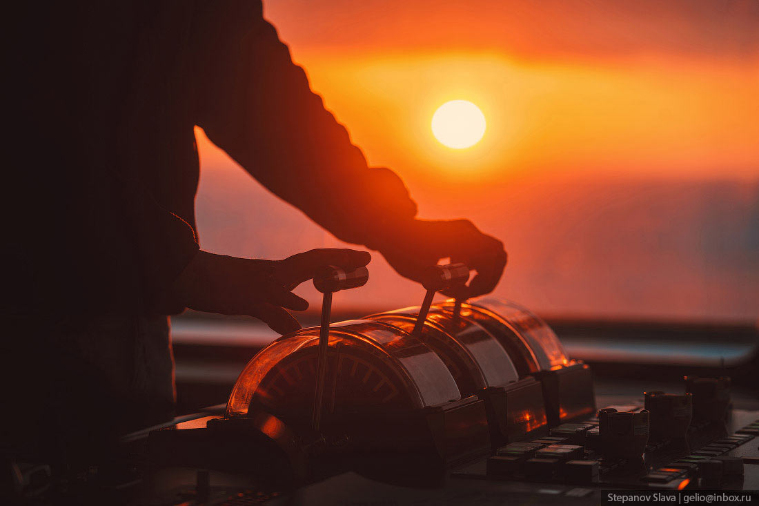 19. Современный атомный ледокол — это гигантский компьютер. Можно контролировать ключевые параметры на мониторах, на ходовом мостике есть приборы контроля за буксирным устройством, камера наблюдения за буксиром, эхолоты, репитеры гирокомпаса, радиостанции, электронное навигационное оборудование, спутниковые системы. Часть внешнего оборудования имеет систему подогрева, чтобы электроника работала без перебоев в любой мороз.
