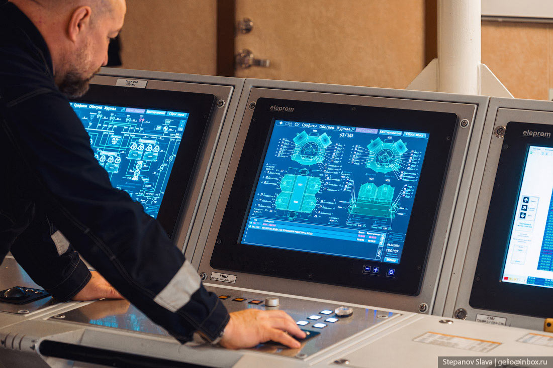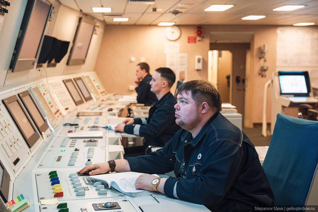 37. В ЦПУ работает целая команда технических служб: инженер-оператор управляет каждым из двух реакторов «РИТМ-200», электромеханик контролирует электроэнергетику, инженер службы радиационной безопасности следит за показателями радиации. Руководит вахтой старший вахтенный механик, который находится на постоянной связи с ходовым мостиком ледокола.