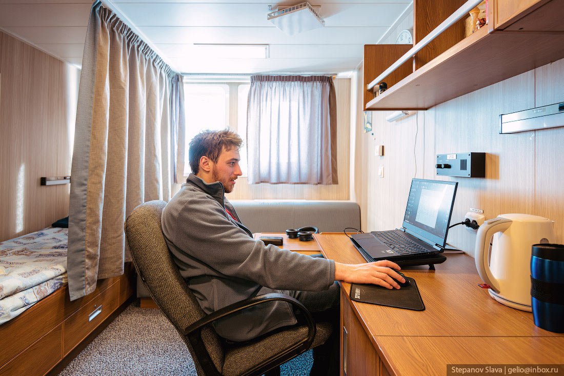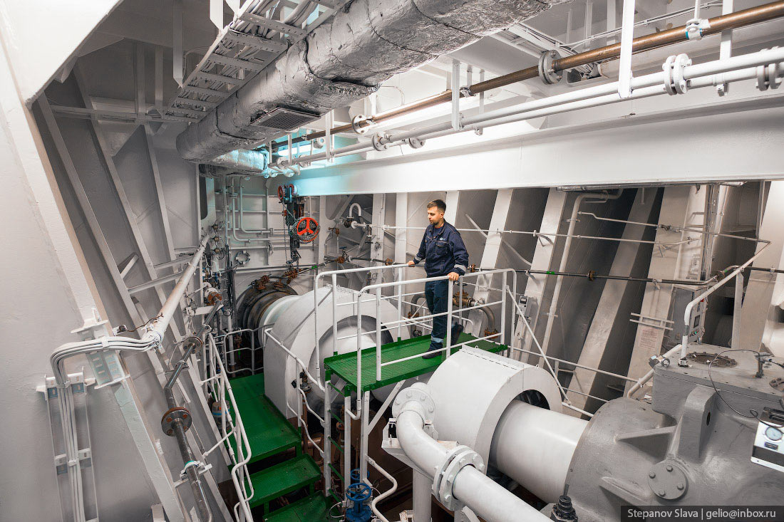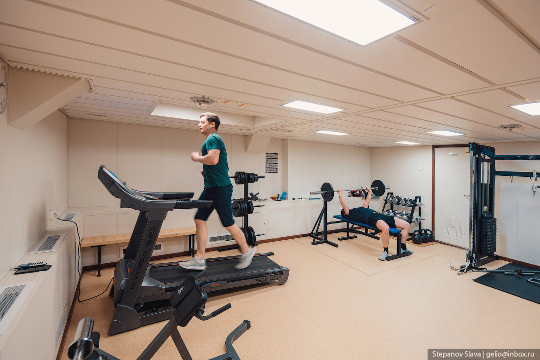 44. Ледоколы полностью автономны — здесь есть свои спортзалы, бассейн, сауна, телевидение, спутниковый интернет и даже солярий. Атомоход на несколько месяцев становится для команды полноценным плавучим домом.