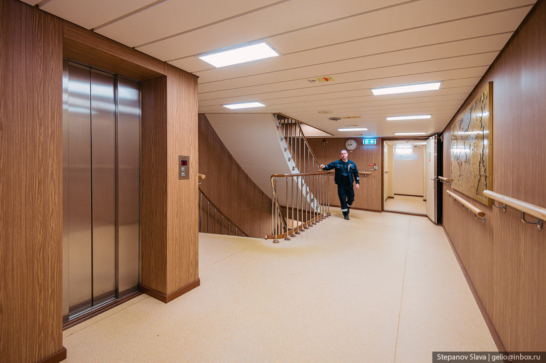 41. Внутри всё похоже на обычный дом — есть широкие лестницы, лифты. Зимой температура снаружи может падать до -50 °С, вокруг ледокола полярная ночь — а внутри уютно и светло.