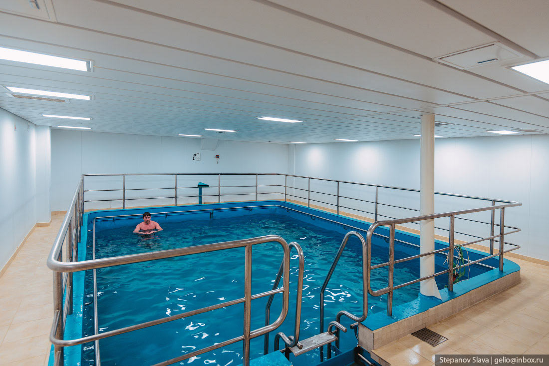 45. Одна из любимых игр экипажей — волейбол. На ледоколе проводятся матчи и турниры, которые назначаются заранее. 46. Вода в бассейне морская — она подаётся снаружи, очищается и подогревается до комфортной температуры. Так команда ледокола может безопасно искупаться во всех морях, где работает атомоход.