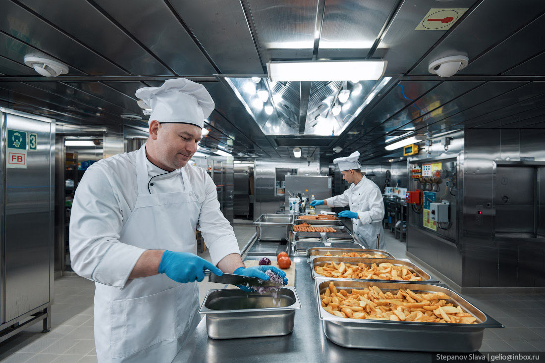 50. На ледоколах трёхразовое питание, а меню расписано на несколько дней вперёд. Камбуз находится на 4 этажа ниже столовой, еда подаётся специальным лифтом. Здесь же стоят вместительные холодильники, в которых хранится запас продуктов на несколько месяцев автономного плавания.