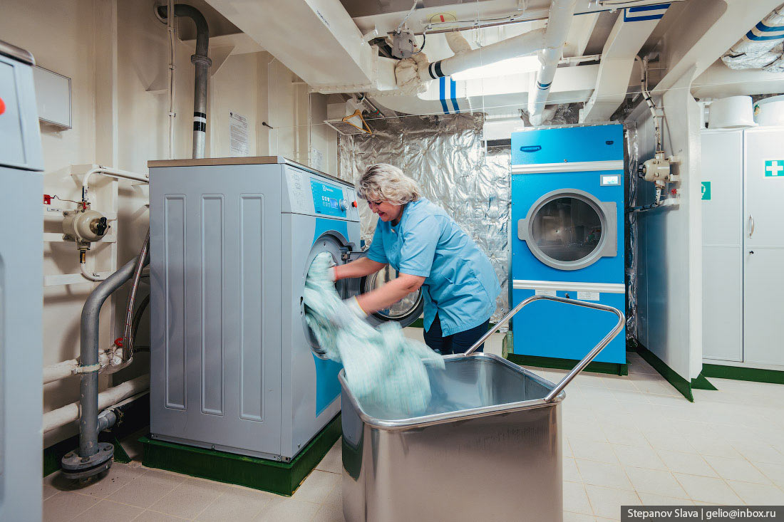 53. На судне есть своя прачечная с большими стиральными и сушильными машинами. Есть и оборудованная операционная, стационар, изолятор, кабинет терапевта.