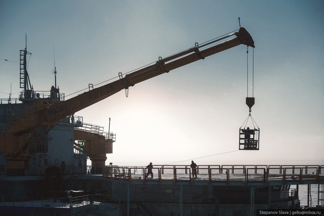 66. Ледоколы оборудованы кранами в носовой и кормовой части. В порту при помощи кранов на ледоколы поднимают провизию, а во время походов через льды — передают грузы с одного судна на другое.