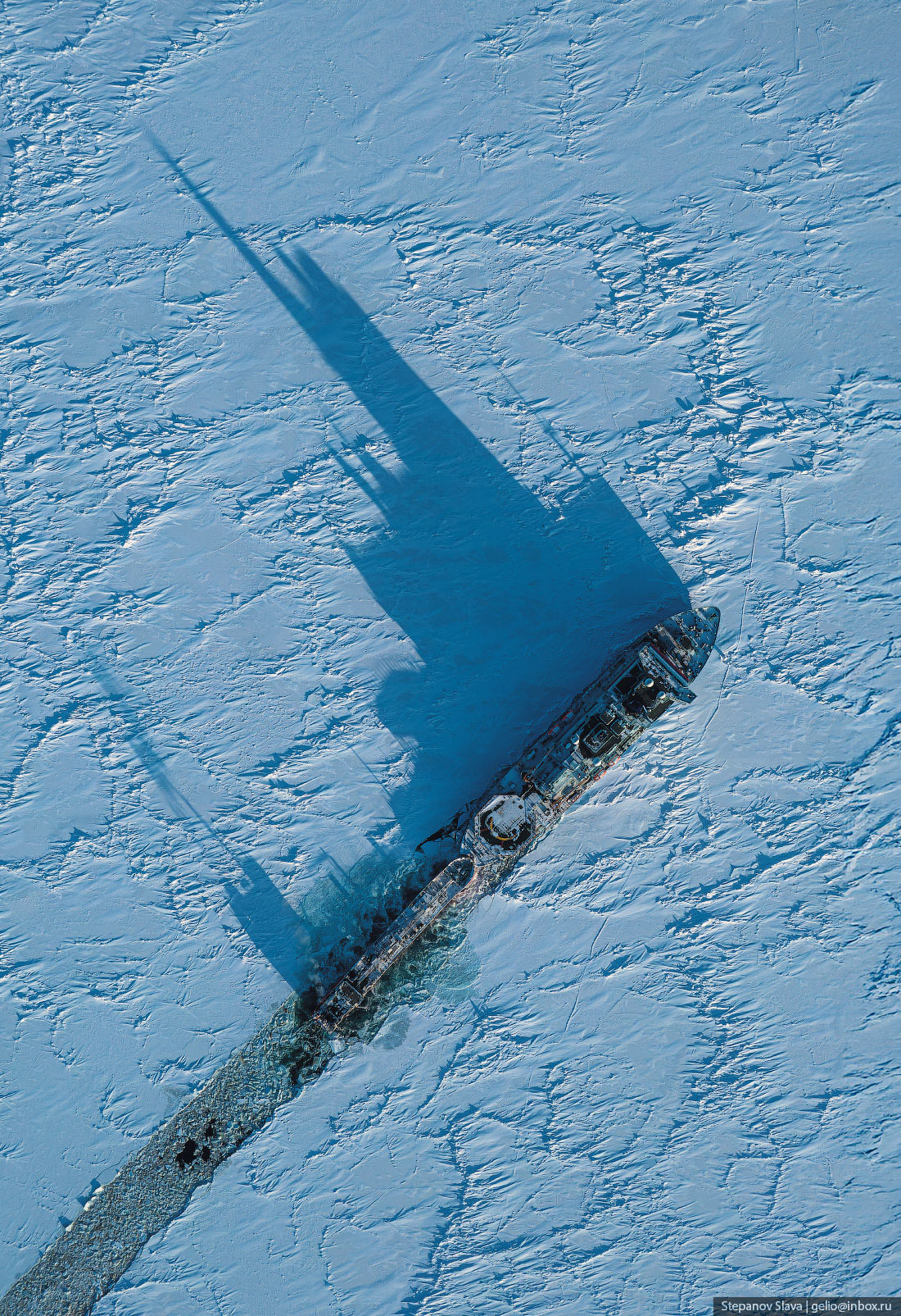 32. На корме ледокола есть специальный вырез, в котором фиксируется нос ведомого судна. В результате проводимое судно буквально прикрепляется к ледоколу и точно повторяет его движения во льдах.