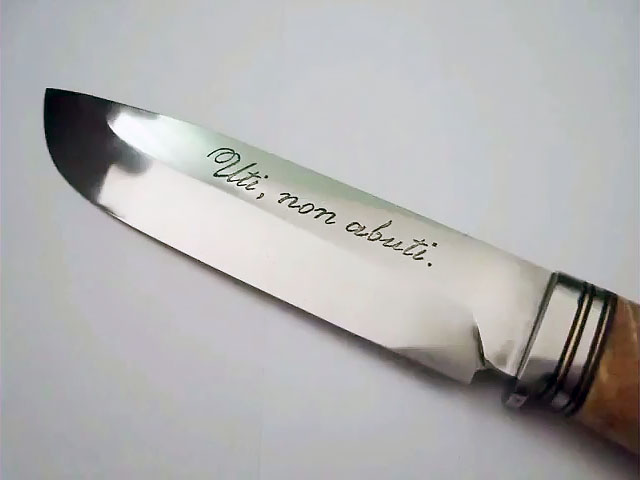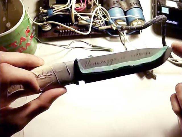 При желании самостоятельно украсить клинок ножа надписью, узором или мелким рисунком, лучше всего это сделать электрохимическим методом. Он дает большую гарантию получения желаемого результата, чем механическая гравировка неопытным мастером. Рассмотрим способ контролированного электрохимического травления клинка, которым получится проявить все детали запланированной надписи.