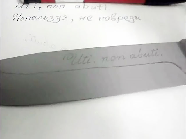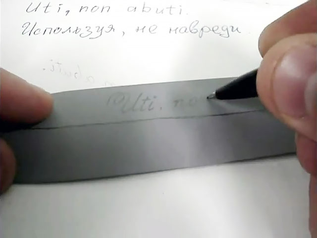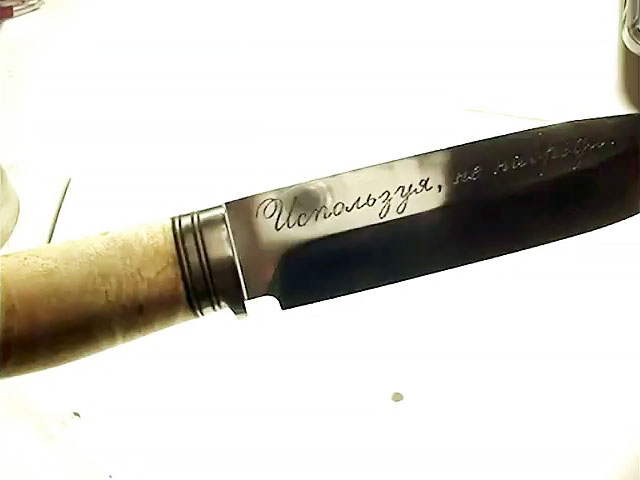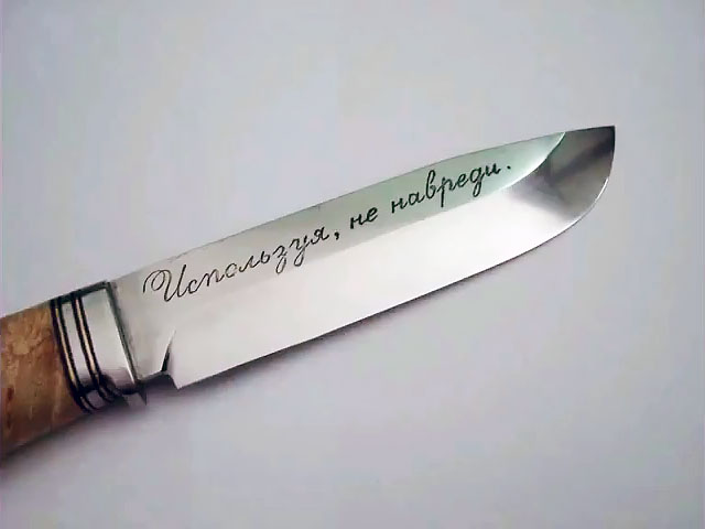 На клинке по сухой грунтовке делается необходимая надпись мягким карандашом.