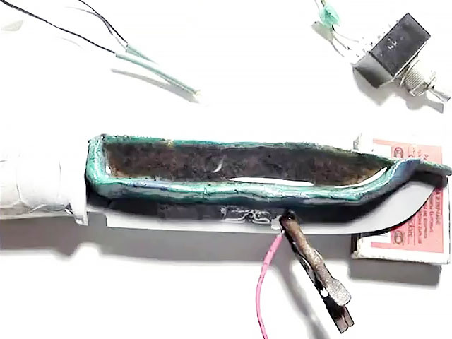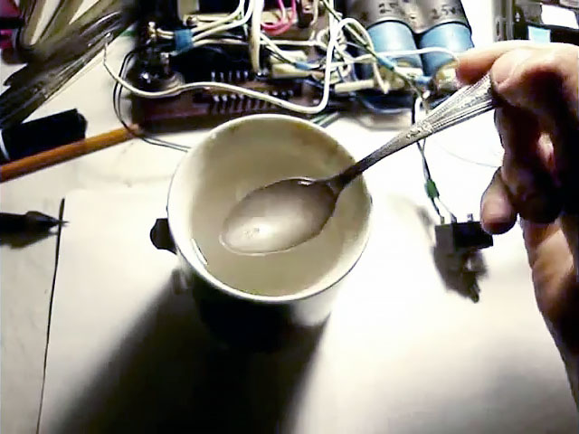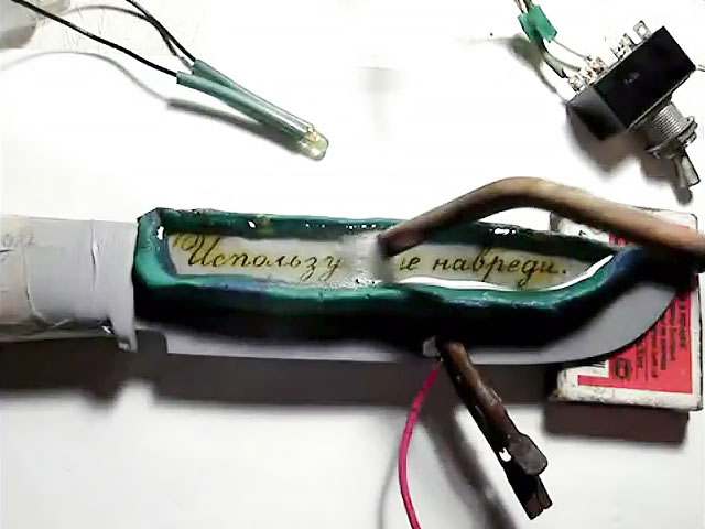К зачищенному месту на клинке присоединяется плюсовой провод от источника питания. После этого пластилиновая ванна заполняется солевым раствором на высоту 3-4 мм.