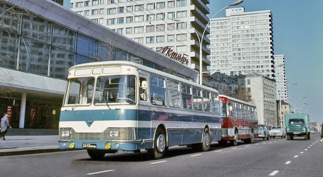 Экспортные версии ЛиАЗ-677 позируют на проспекте Калинина (ныне - улица Новый Арбат) у кинотеатра "Октябрь".