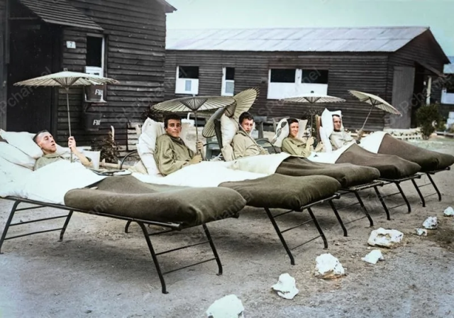 Выздоравливающие британские солдаты принимают солнечные ванны в госпитале в Руане, 1914-1918 год.