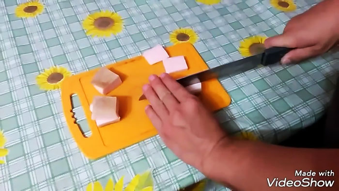 Разрезаем сало на 4 квадратных кусочка, по числу ножек передвигаемой мебели.