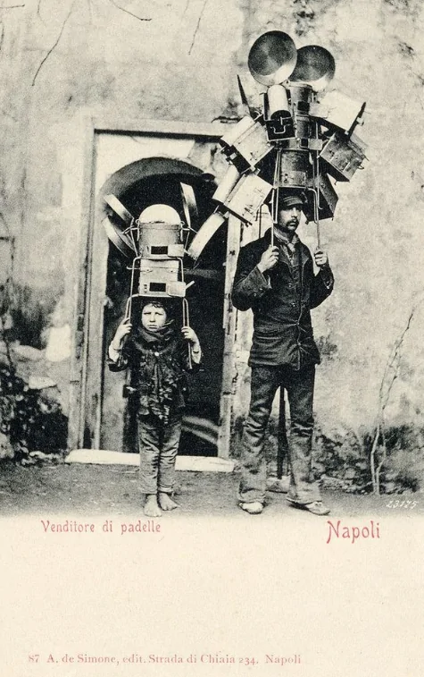Издалека напоминающие огромных роботов продавцы кухонной утвари, Неаполь, 1903 год