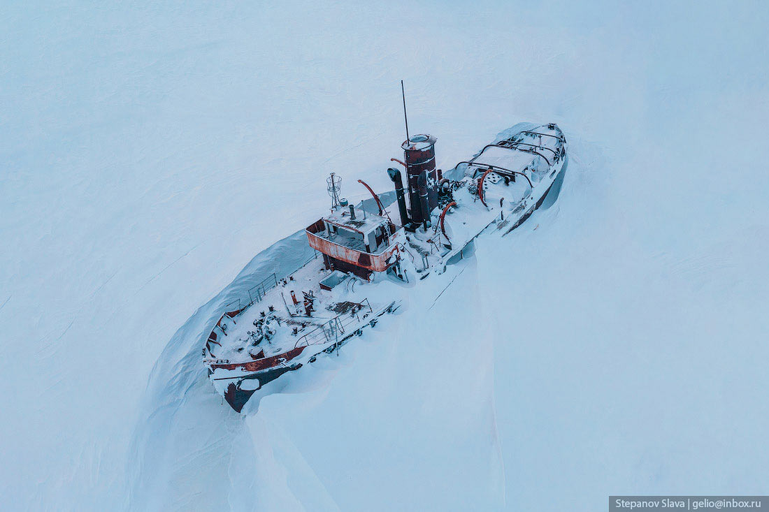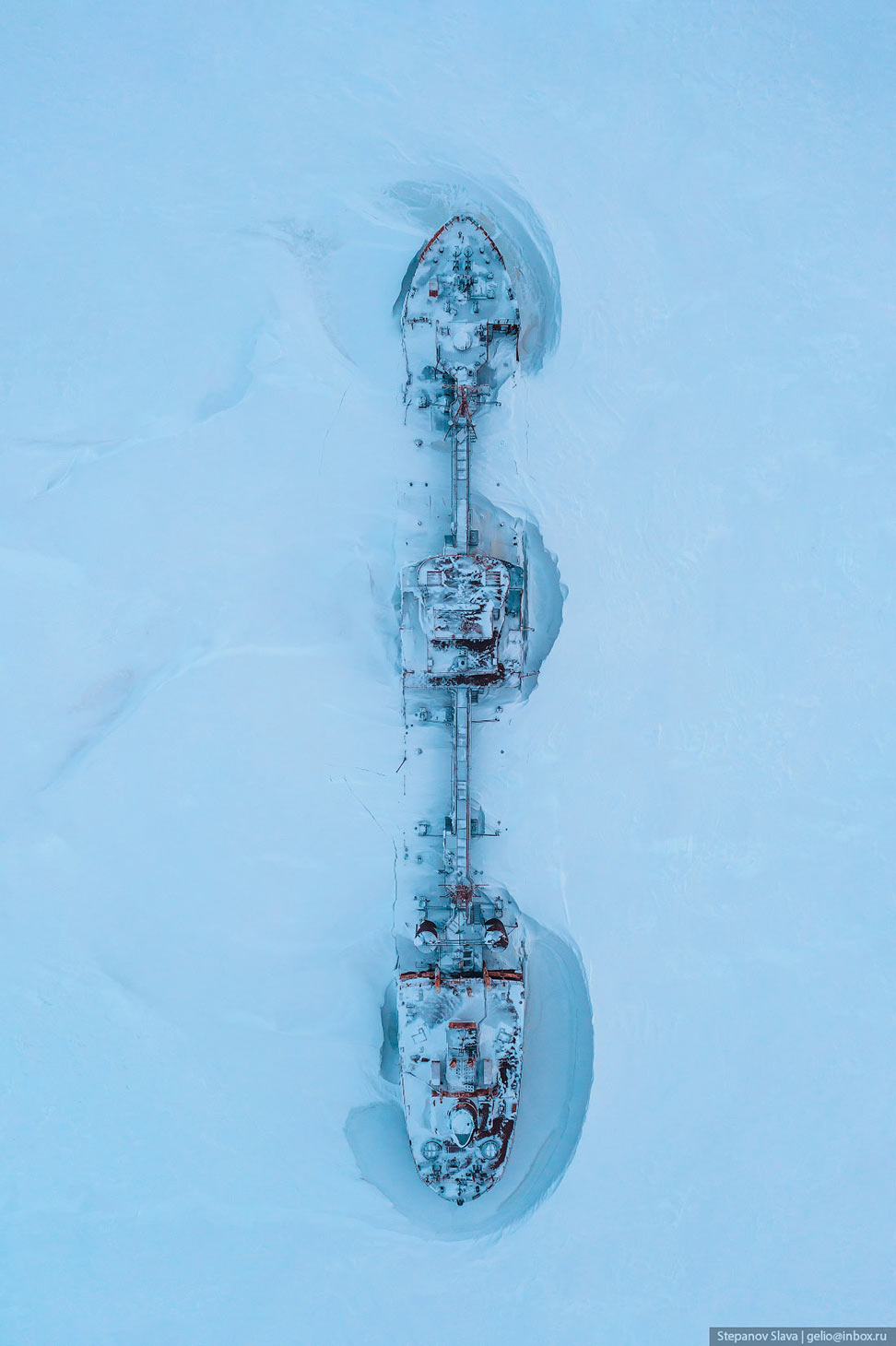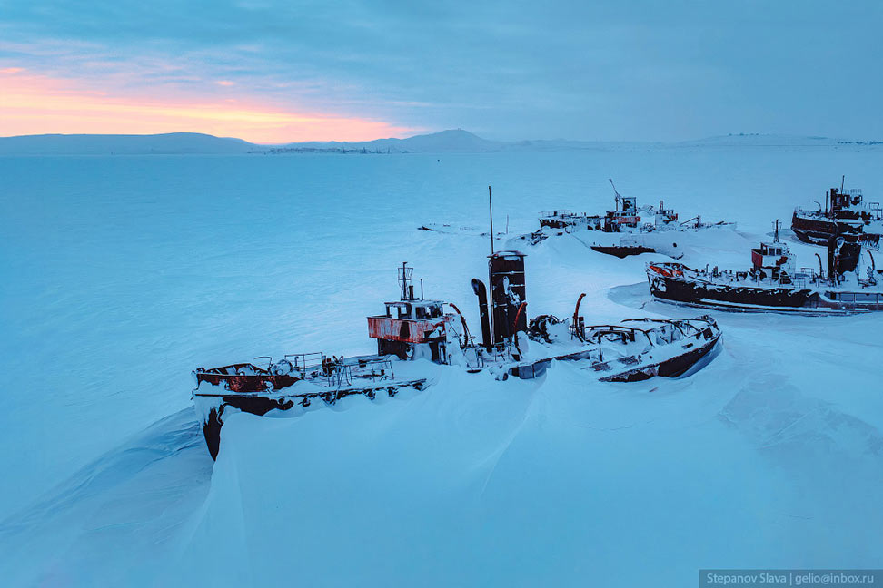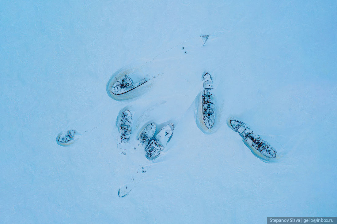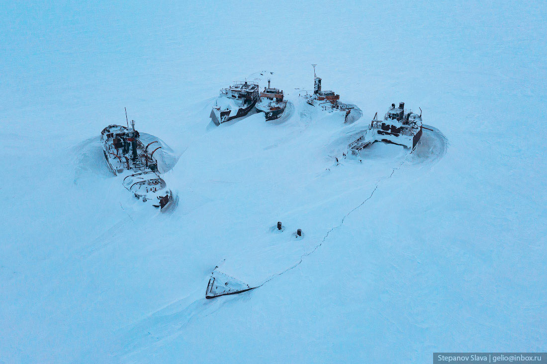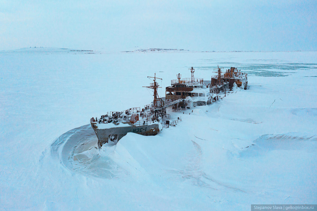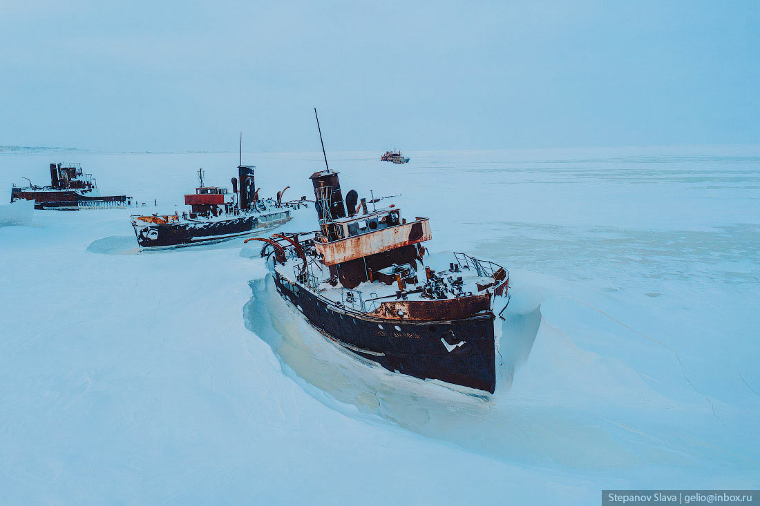 Остров Бруснёва расположен в море Лаптевых, примерно в 5 км от якутского посёлка Тикси. Кладбище кораблей — то, что осталось после отъезда значительной части населения посёлка после распада СССР. Сейчас в Тикси живёт порядка 4,5 тыс. человек, хотя в эпоху своего расцвета в 80-е годы эта цифра доходила почти до 12 тыс. Большое количество судов разного назначения оказались ненужными и брошенными.