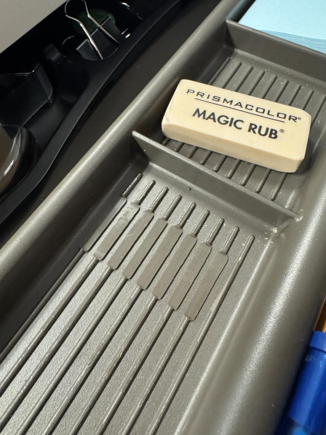 Ластик расплавил пластик в том месте, где он лежал в ящике стола. В состав ластиков входят пластификаторы, которые при контакте с пластиком мигрируют в него, что приводит к его «плавлению».