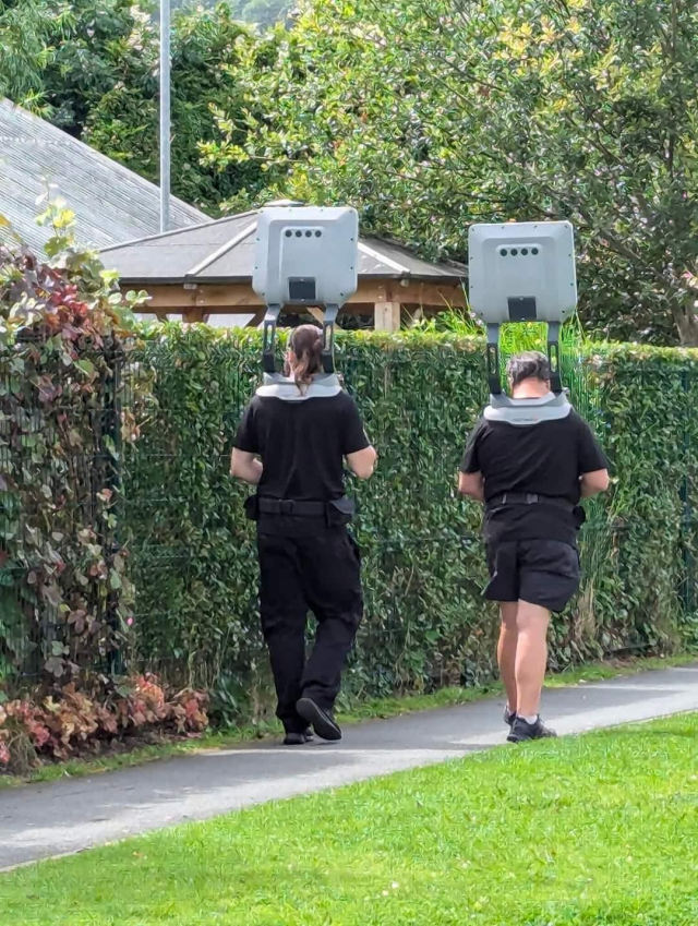 4. Двое мужчин несут наплечные устройства серого цвета с четырьмя чёрными кругами и чёрной квадратной панелью